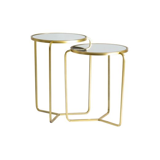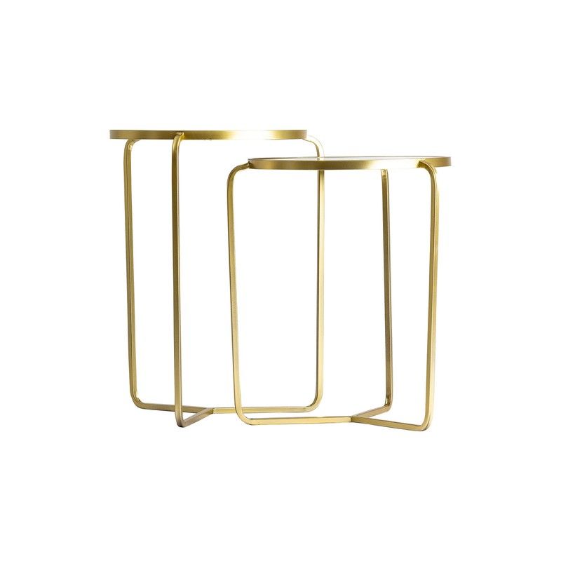 Esclusività ed eleganza permeano questo set di tavoli con struttura in ferro dorato e base circolare in vetro. Il suo colore e la sua natura trasparente offrono un design che ricorda lo stile art déco.